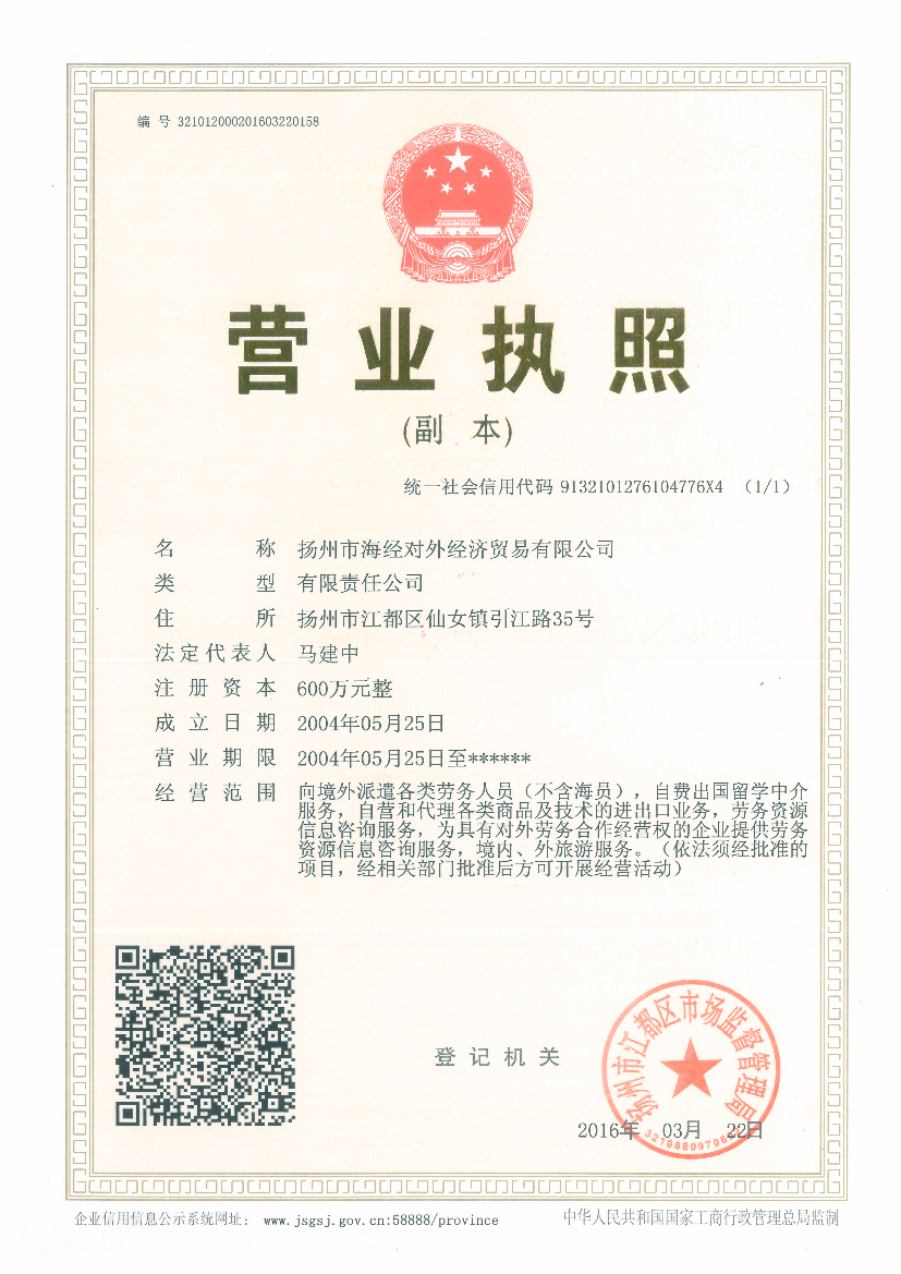 扬州市海经对外经济贸易有限公司成立于2004年,注册资本600万元,是国家商务部批准的具有对外劳务合作经营权的企业,中日研修生协力机构成员,对外承包工程商会会员,从事日本技能实习生派遣近二十年。积累了丰富的管理经验。